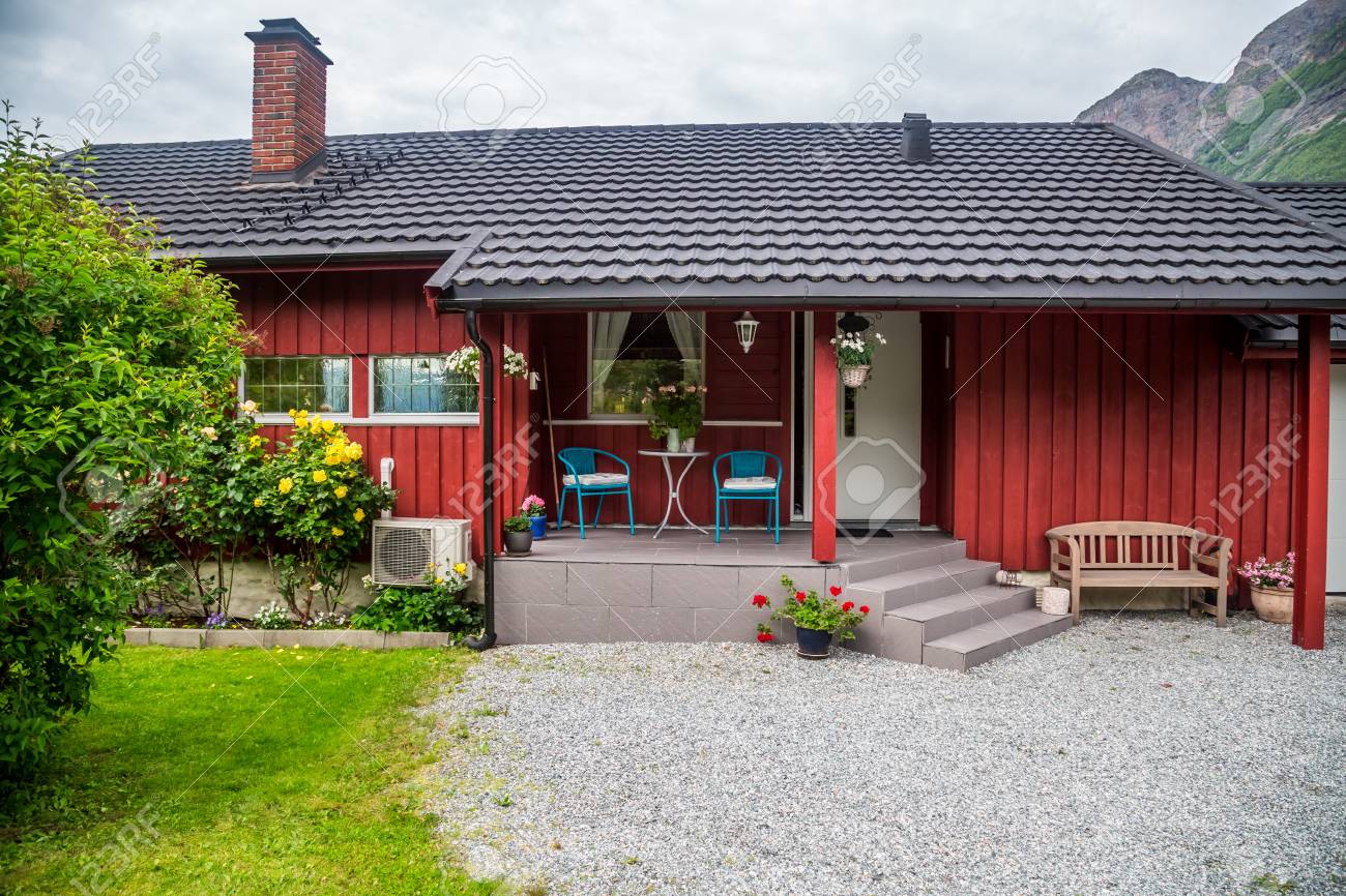 ノルウェーのテラスおよびポーチ鉢植えで美しい明るいレッド ハウス の写真素材 画像素材 Image